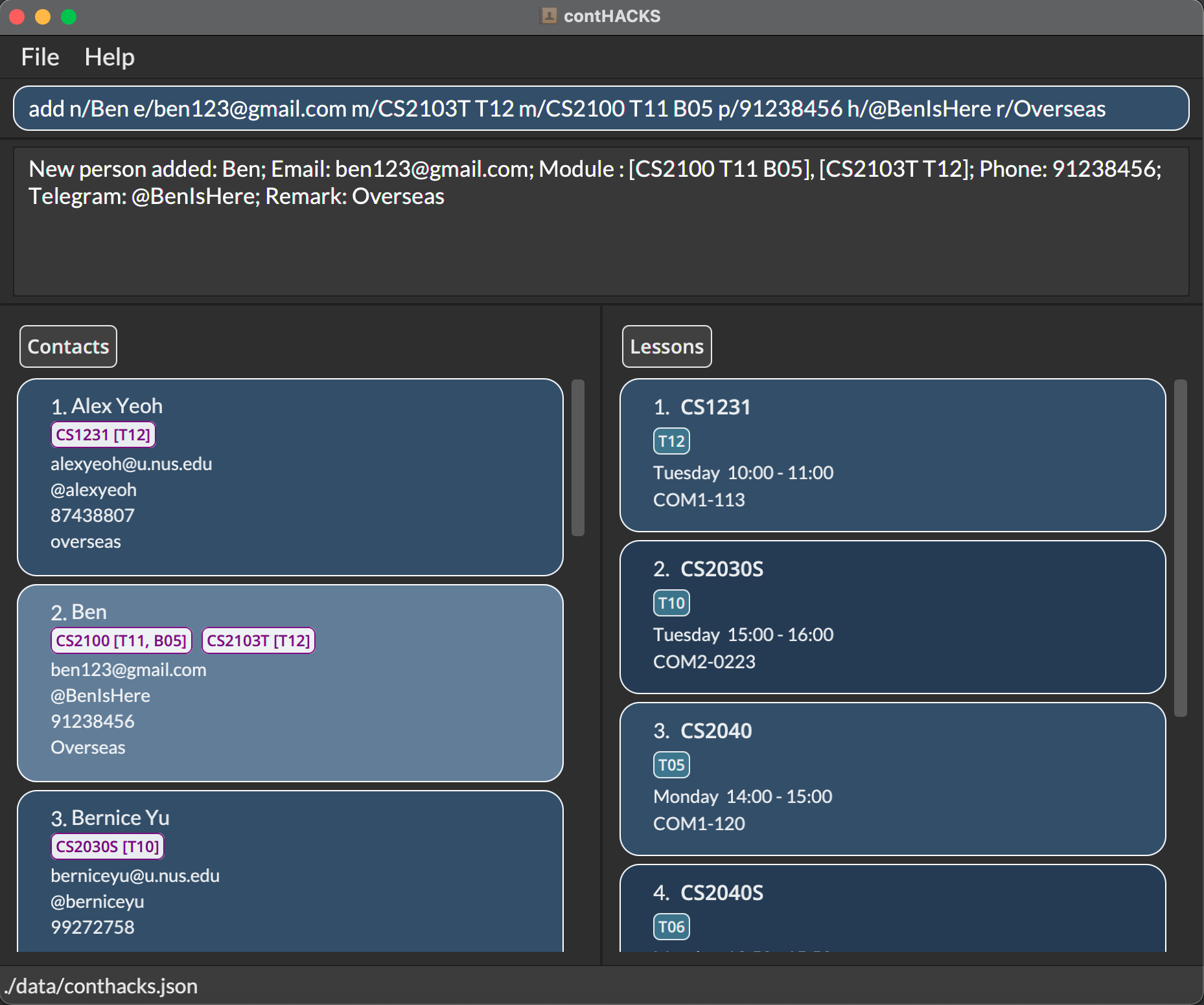 add n/Ben e/ben123@gmail.com m/CS2103T T12 m/CS2100 T11 B05 p/91238456 h/@BenIsHere r/Overseas: Adds a contact using all parameters, with multiple module code and multiple lesson code -