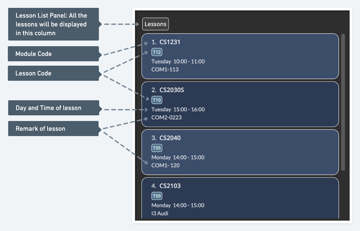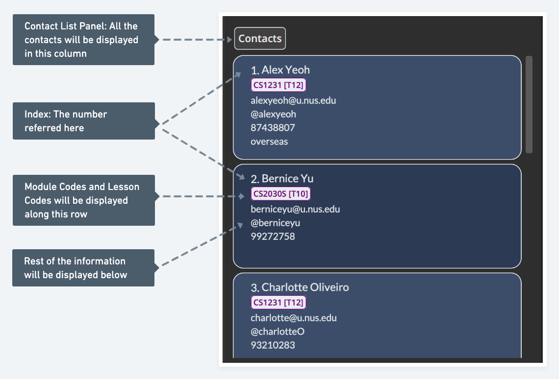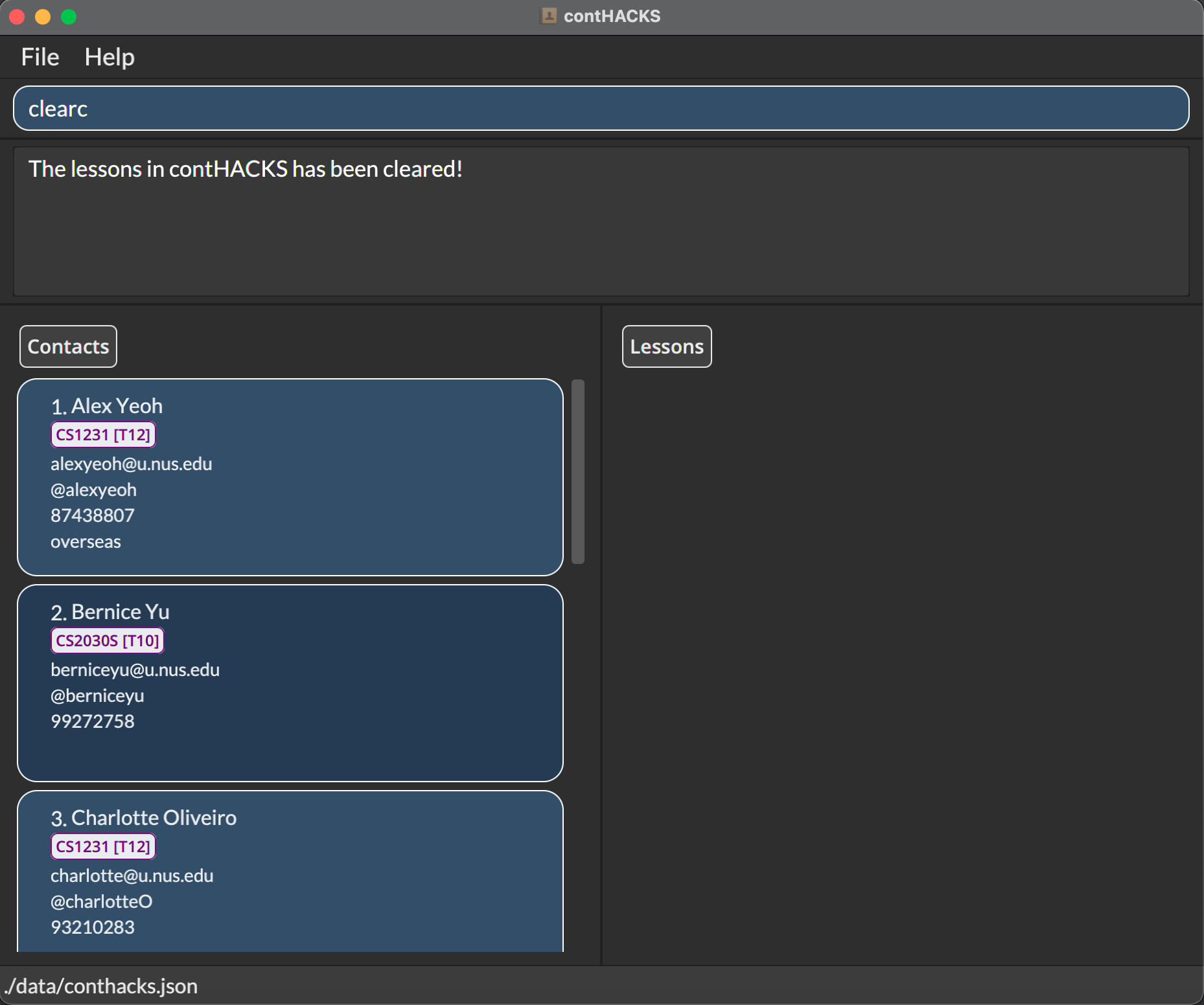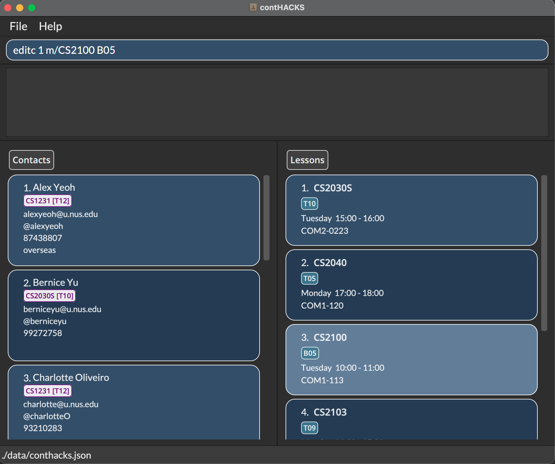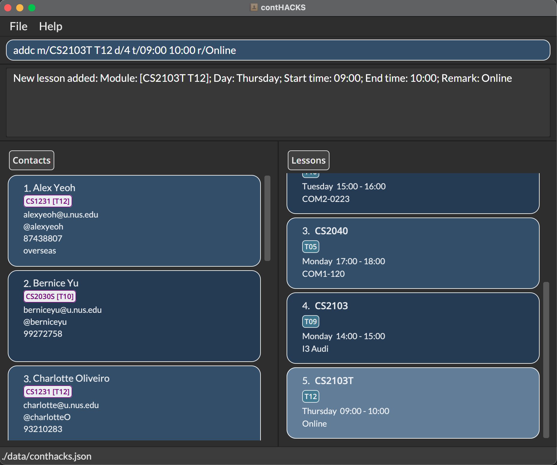 CS2103T G09will not create that lesson in the lesson panel list. - Contacts and lessons are sorted alphabetically after every command by name and module code name respectively.