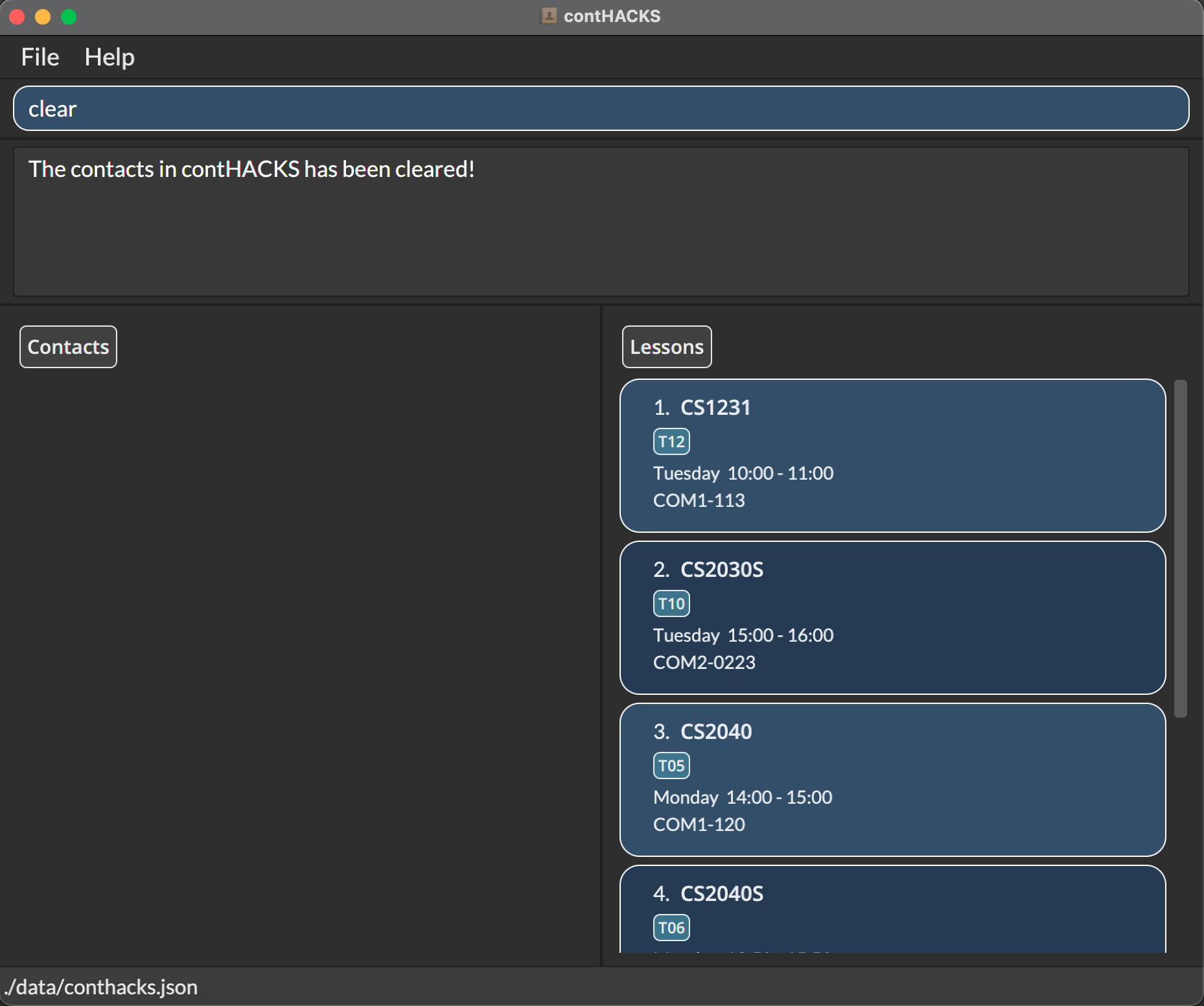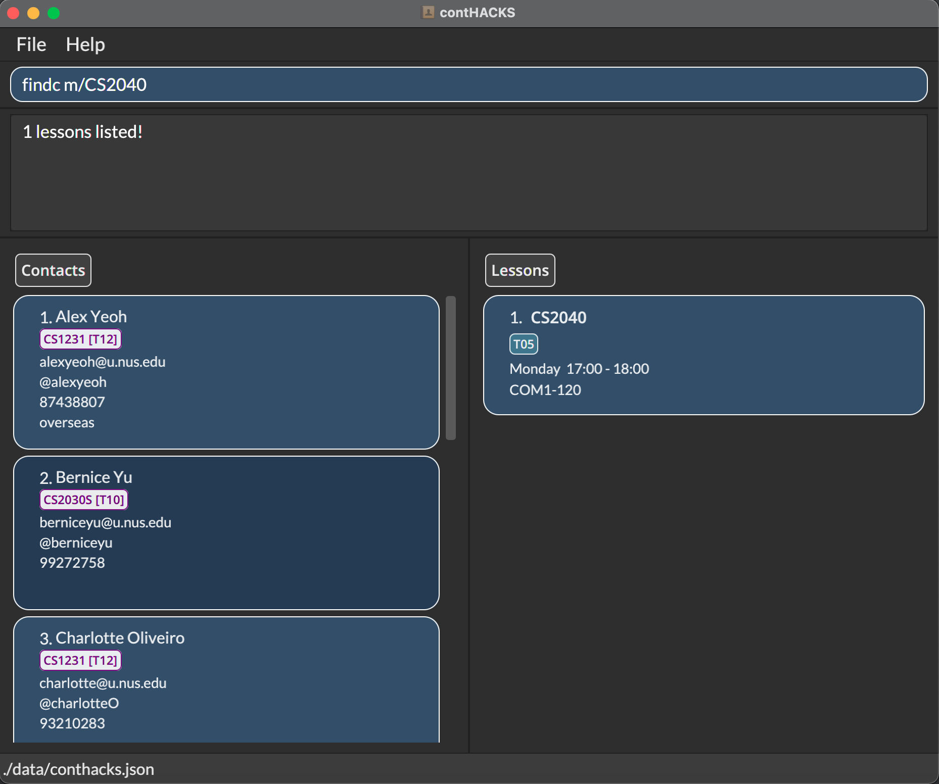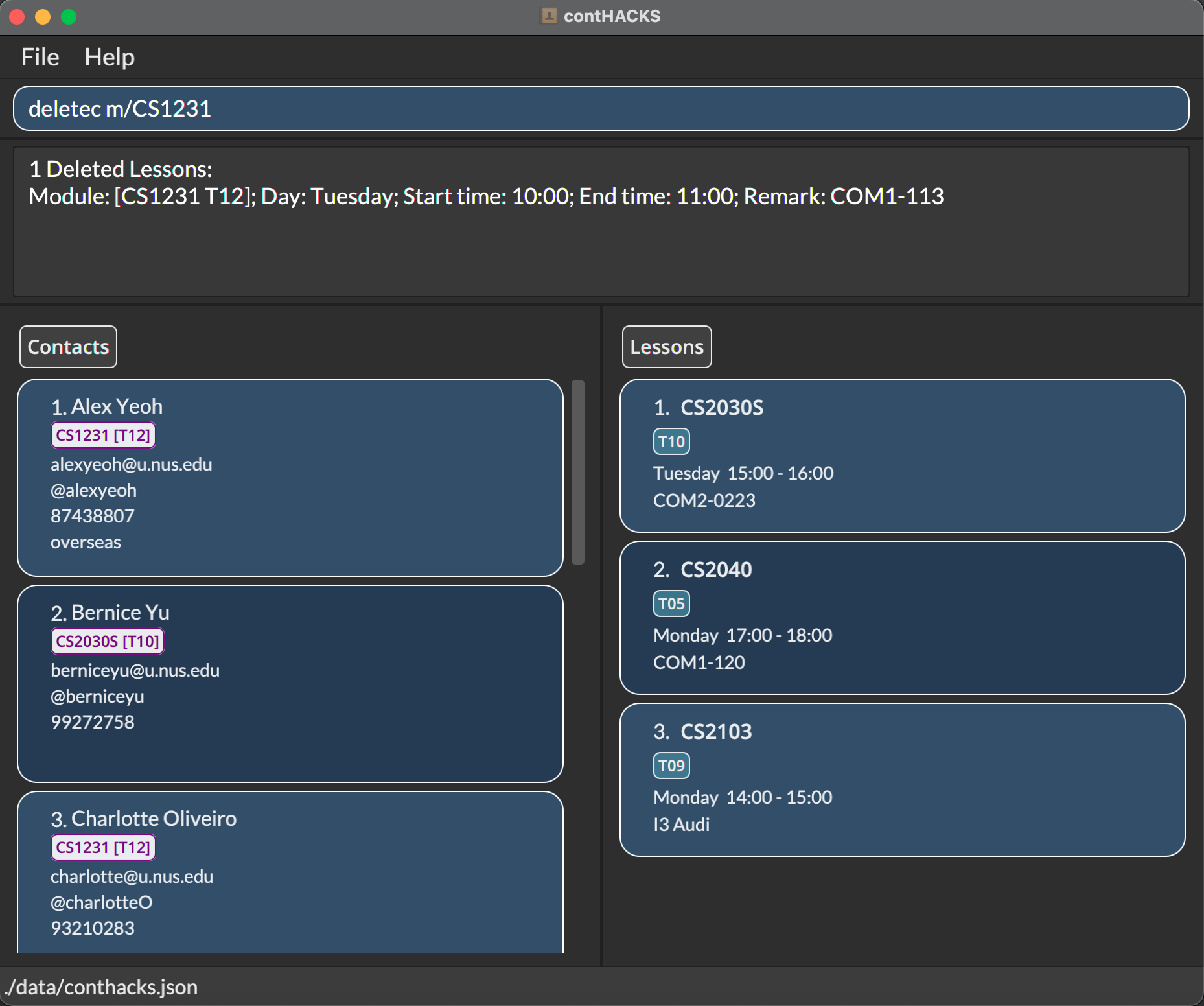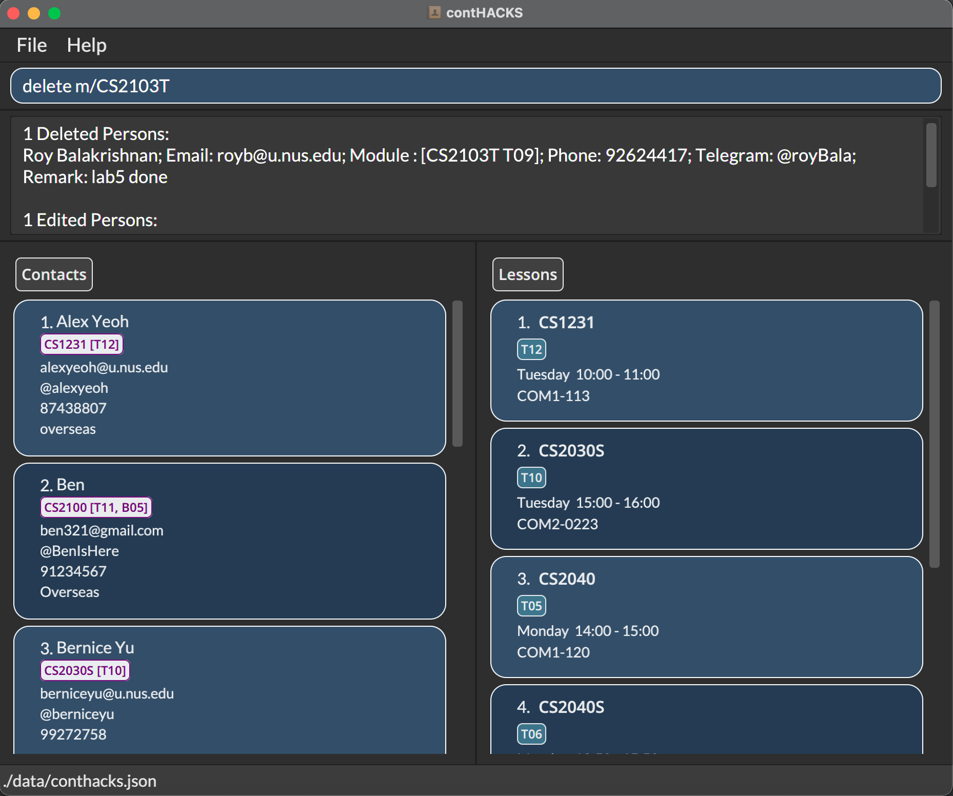 contHACKS is a desktop app to help Teaching Assistants (TAs) in managing contacts. It is optimized for use via a Command Line Interface (CLI) while still having the benefits of a Graphical User Interface (GUI). contHACKS streamlines the creation, reading, updating and deleting operations of contacts to make it fast and efficient for TAs, easing your workload to focus on the more important task - teaching.